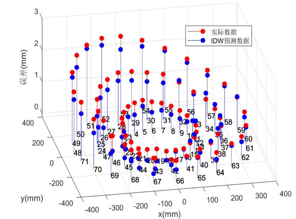 插值预测方法对整个运动平面的视觉测量误差进行插值预测,并使用激光跟踪仪测量一系列机械臂末端位置的运动误差数据与预测数据进行对比,检验插值预测方法预测的效果,从而得到此方法对视觉测量系统的精度提升效果,空间插值方法可以大致推断出整个视觉测量平面的视觉测量误差分布。抽取部分预测点位的视觉测量误差与实际测试得到的视觉测量误差进行做对比。