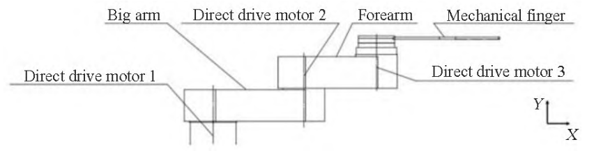 机器手总体传动包括平面传动和升降传动, 平面传动由直驱电机驱动三个旋转关节 , 升降传动由伺服电机驱动丝杠螺母实现。 平面运动机构由三个手臂和直驱电机组成 , 其中小臂 、 大臂 、 末端执行器 ( 机械吸盘手指 ) 的回转运动关节均通过直驱电机直接驱动,升降运动机构的结构原理是通过安装在底座的伺服电机驱动滚珠丝杠。