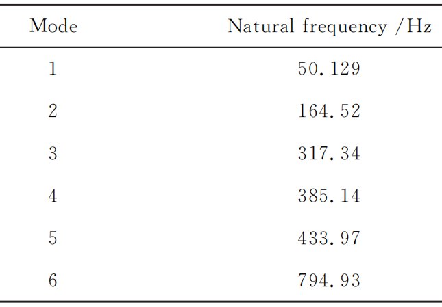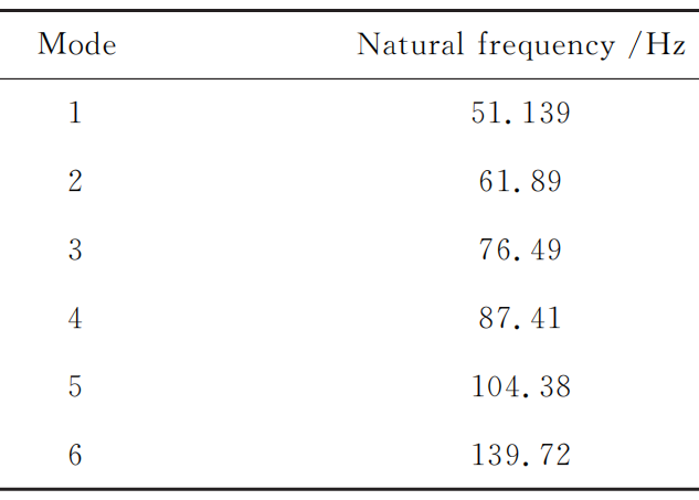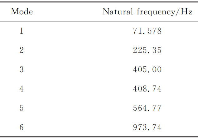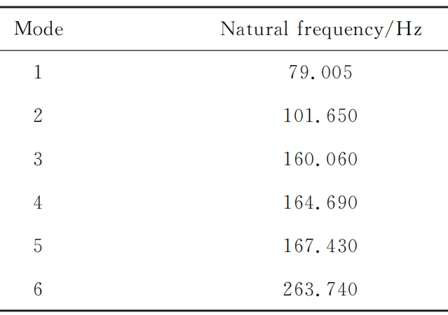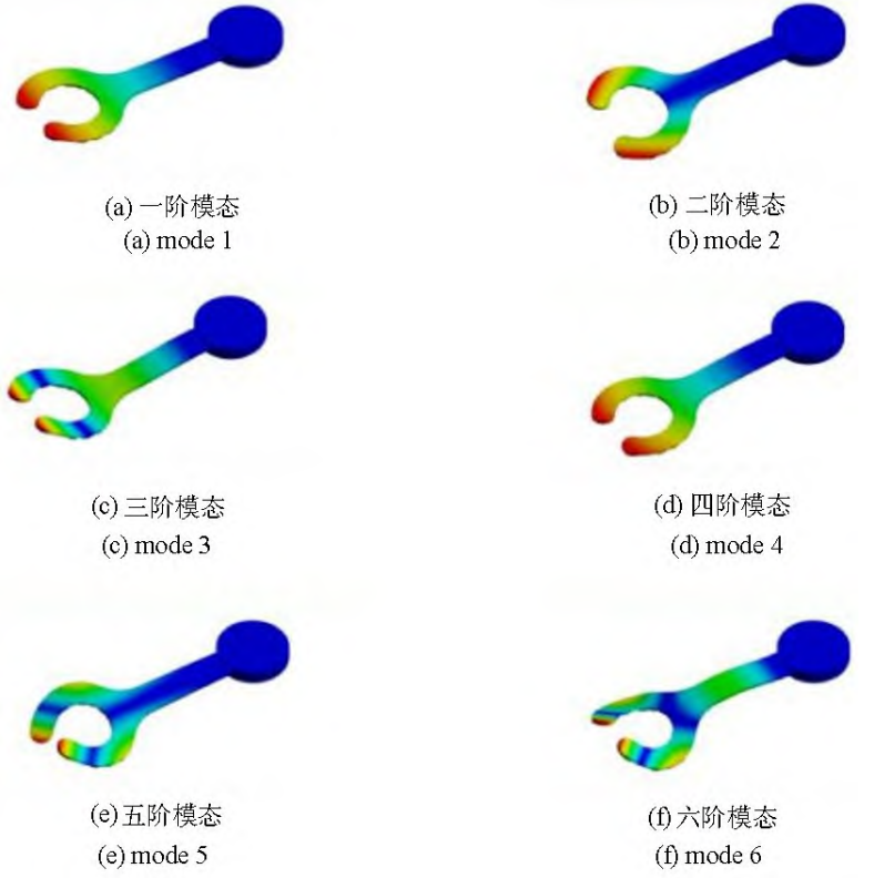 将机械 手 指 三 维 模 型 导 入 到 Ansys Workbench 中 , 为满足轻量化设计要求, 模型主要材料设置为铝合金,在机械手指的接触设置中, 由于其结构主要是通过螺栓连接固定在一起 , 在运动的过程中各零部件也没有相对运动情况 , 故其接触方式默认为Bonded 模式,对模型进行网格划分 ,单元尺寸设置为2mm, 共划分 60212 个节点 ,31046 个单元, 在手指与小臂连接处添加固定约束后 , 对其 1~6 阶模态进行求解, 最终得到前六阶模态固有频率如下所示
