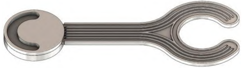 通过观察机械手指一阶模态频率及振型可知,手指一阶模态频率较低仅为50Hz,与执行器振动源频率接近,为避免共振现象产生, 通过加强筋和加宽优化的方式,增加在振型方向上的厚度,对结构进行优化,考虑到在机械手指的上端面增加厚度的同时,也会提高机械手指的质量,为了满足轻量化的要求,通过均匀轮形筋结构设计,降低质量的增幅的同时保证刚度的提升.