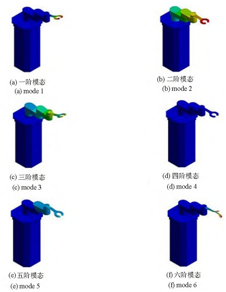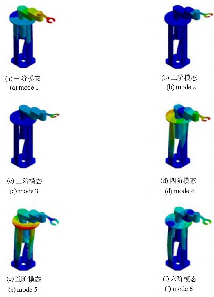 机器手的主要材料为铝合金,连接关系定义默认为 bonded,网格尺寸设置为3mm,其中节点数为1547272,单元数为769801,模态分析设置求解阶数为6阶.之后 对模型进行支撑约束 ,分别在底板底端、丝杠与电机连接支撑件下端面设置固定约束,丝杠联轴器轴段设置圆柱面约束,得到6阶模态如下: