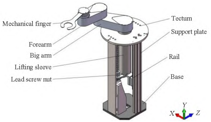 scara机械臂结构包括平面运动机构 、 升降运动机构和底座, 其中平面运动机构由机械手指 、 小臂 、 大臂 、 直驱电机组成, 升降机构由升降套筒 、 丝杠螺母以及导轨组成, 底座部分安装有伺服电机。