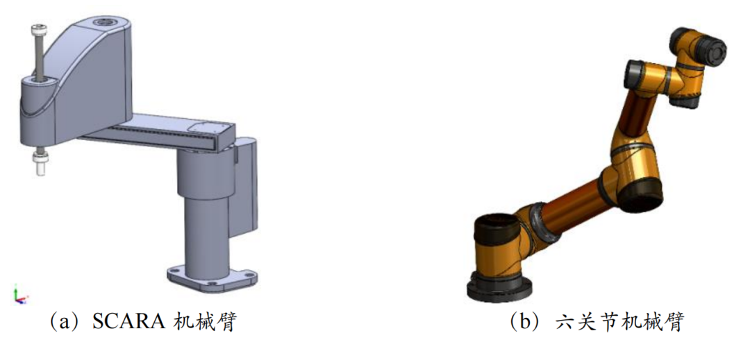 基于选定的 SCARA 机械臂和六关节机械臂分别建立复合机器人的机器人及三维模型。