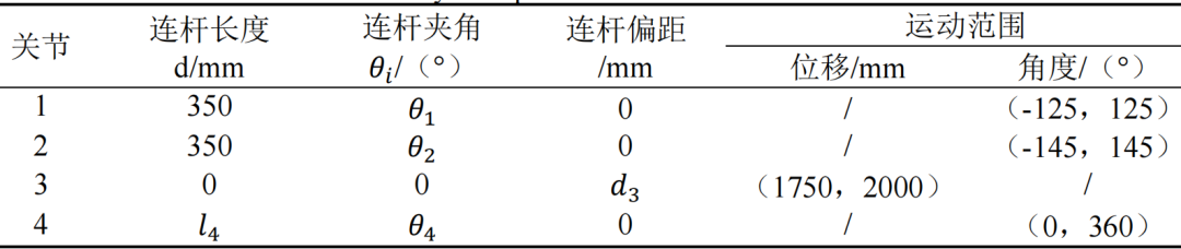 SCARA 机械臂只有四个自由度,包括大臂、小臂的回转运动、末端执行器绕 Z 轴旋转和沿 Z 轴上下运动D-H 连杆参数如下