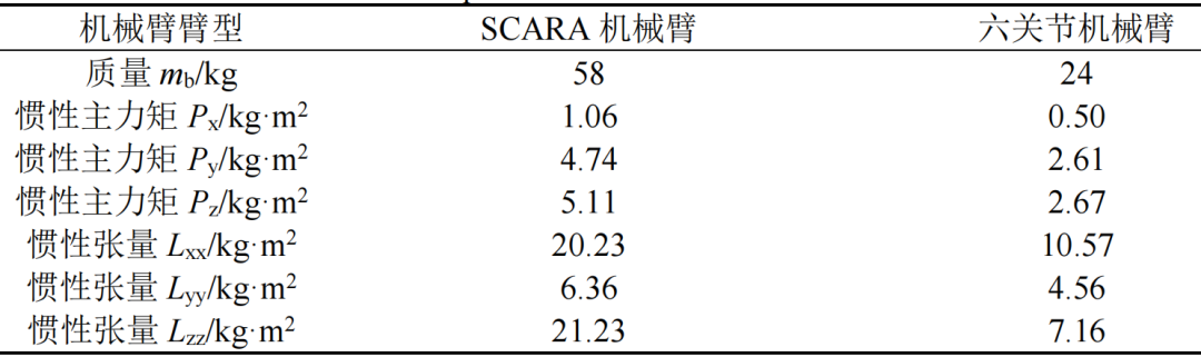 在高速运动过程中,机械臂产生的水平横向惯性力矩会使机器人相对重心产生侧向倾覆力矩,导致小型机身难以保持平衡,降低采摘定位精度,并增加倾覆风险,两款机械臂的转动惯量如下: