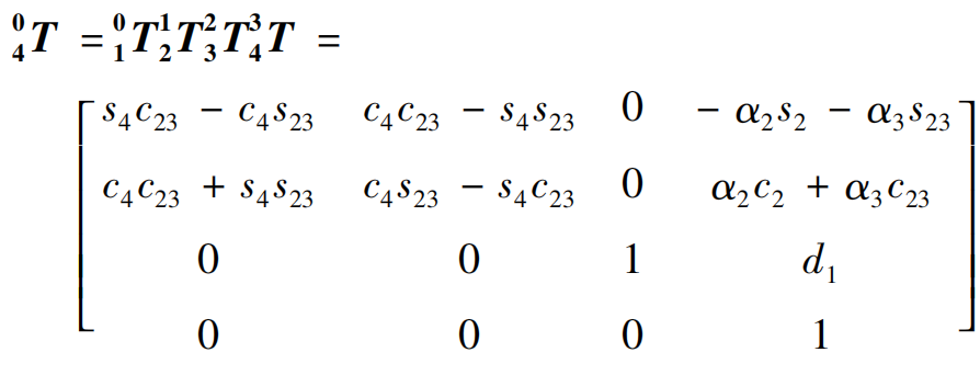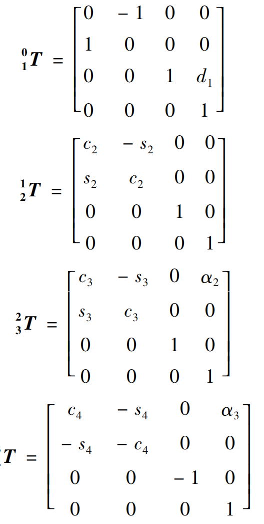 由机器人连杆坐标系与 D-H 参数表,得到各坐标系齐次变换矩阵分别为