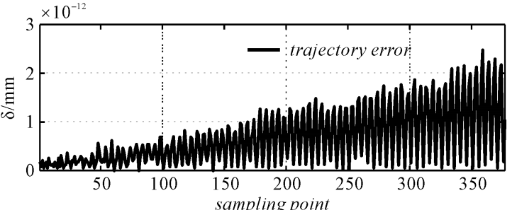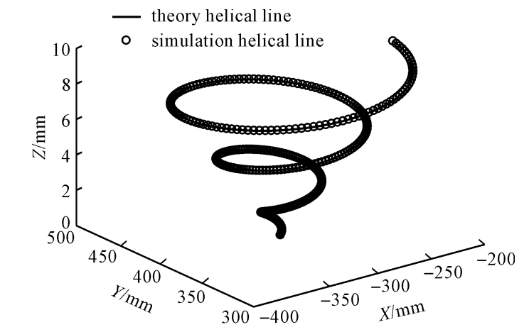 选取空间阿基米德螺线为待仿真轨迹,以直线 x = - 300 ,y = 400 为空间阿基米德螺线中心线,5 mm /rad 为阿基米德螺旋线系数,以 π 为螺距生成空间螺旋线,以 0. 05 rad 为步长取样,将空间阿基米德螺线离散为 377 个样本点,机器人运动学分析所得逆运动学反解,实现了精确控制机器人末端执行器的位置。