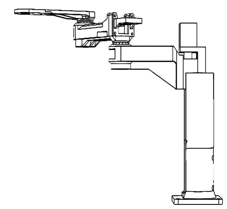 SCARA 机器人由基座 、 大臂 、 小臂和腕部组成,基座与大臂间连接称为肩关节,大臂与小臂间连接称为肘关节,小臂与腕部间连接称为腕关节。