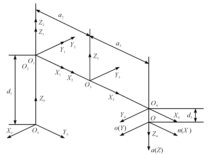 SCARA 机器人连杆坐标系及机器人 D-H 参数与关节变量如下: