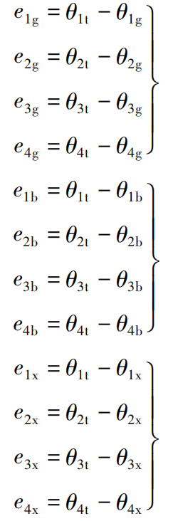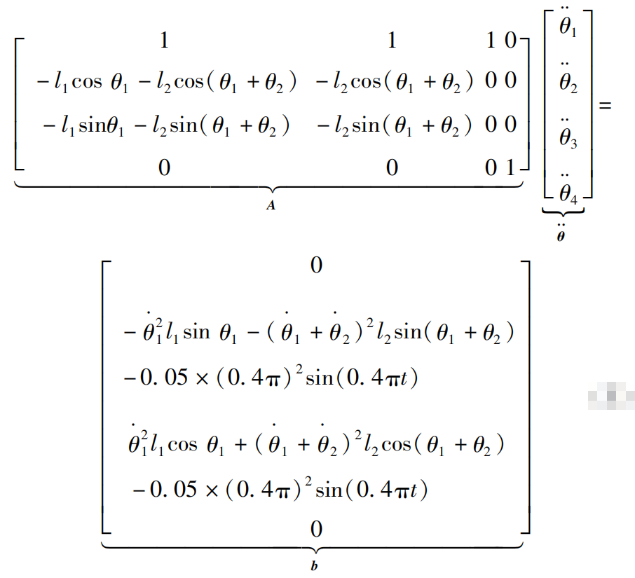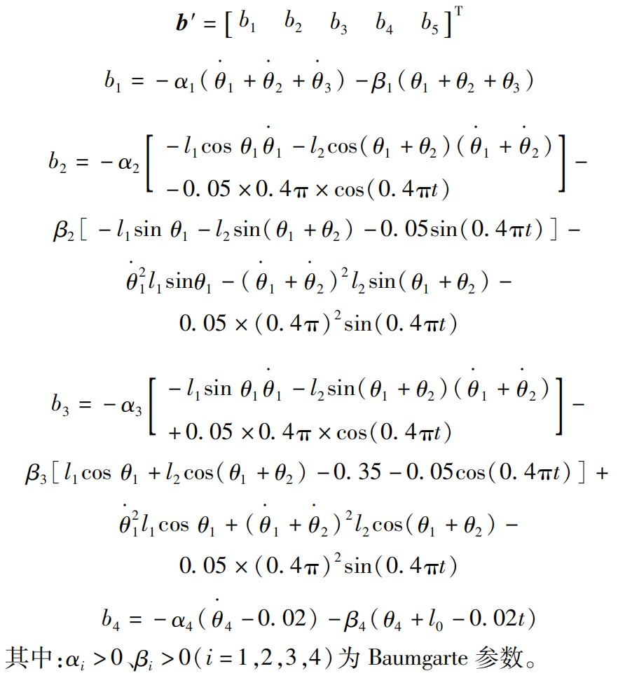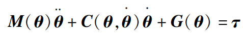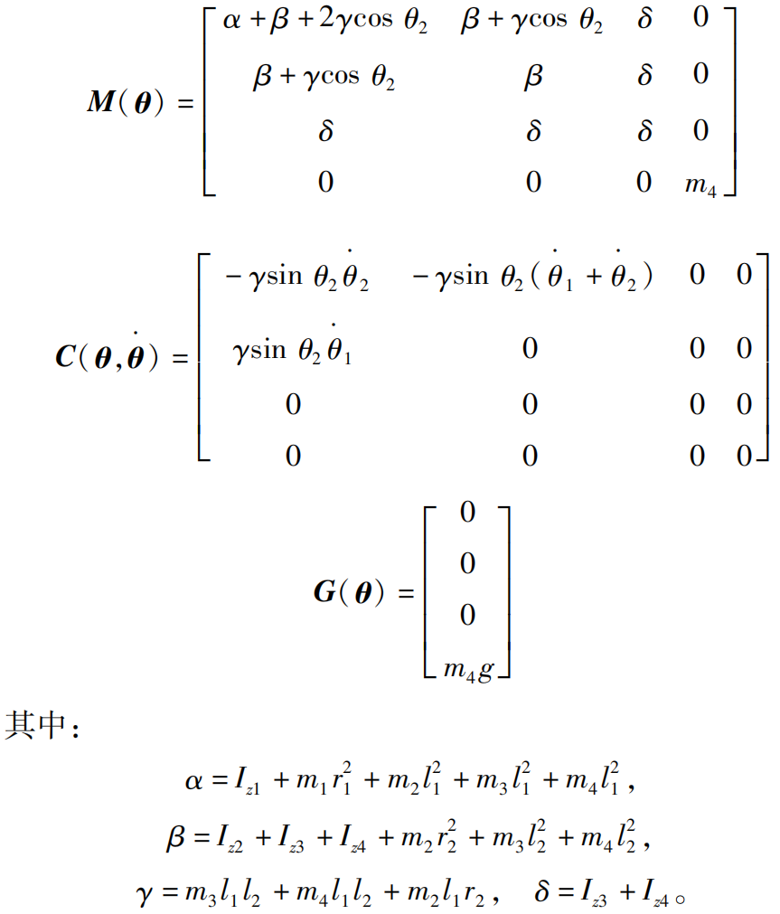 其中:质量矩阵 M ( θ )、向心力和哥氏力矩阵 C ( θ , θ·)、重力矩阵 G ( θ )分别为