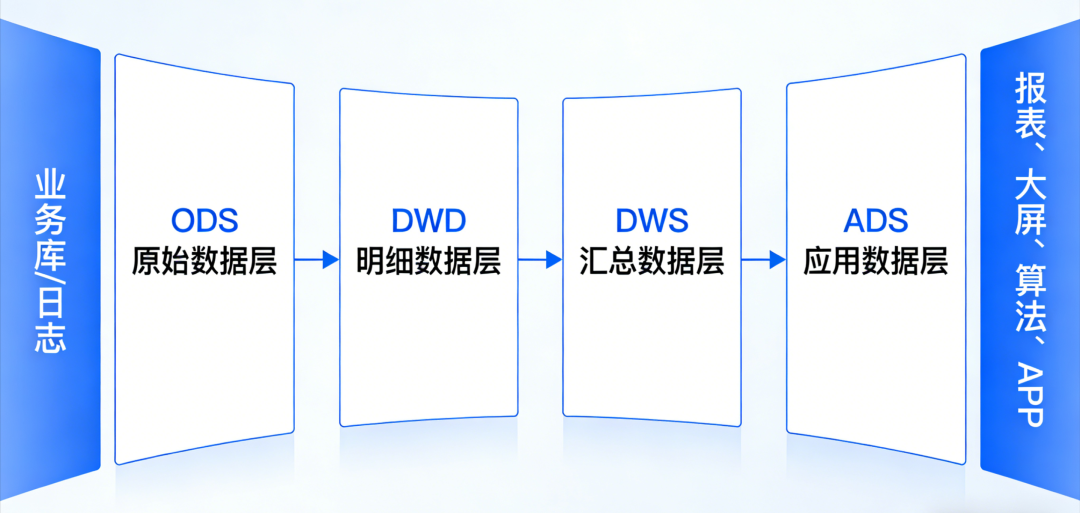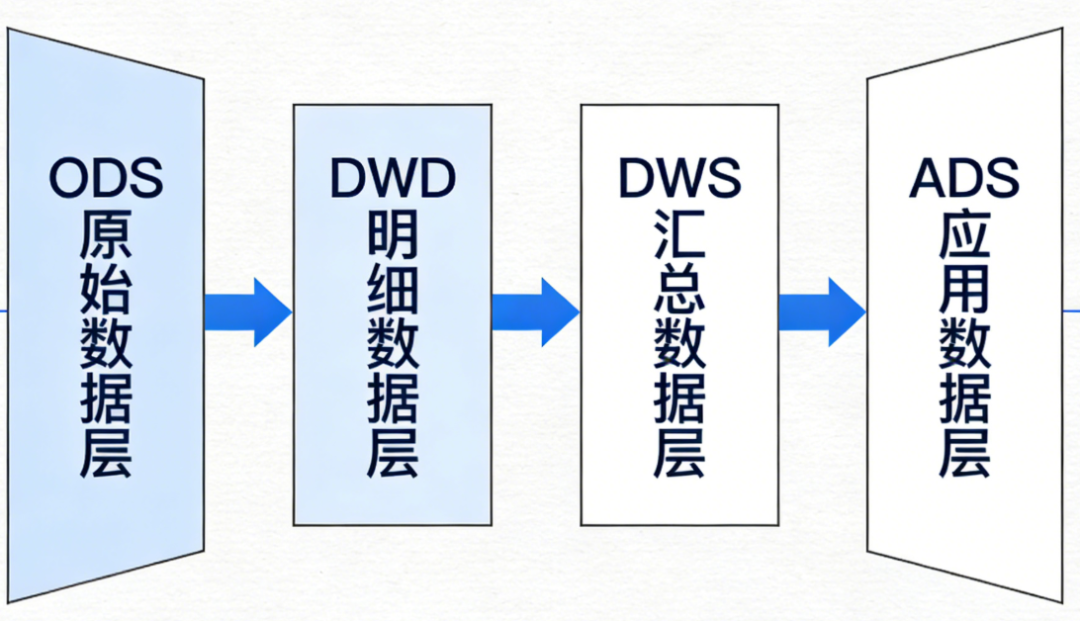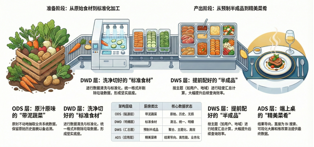 大数据的 ODS、DWD、DWS、ADS 四层架构,干的就是这条流水线的活儿。