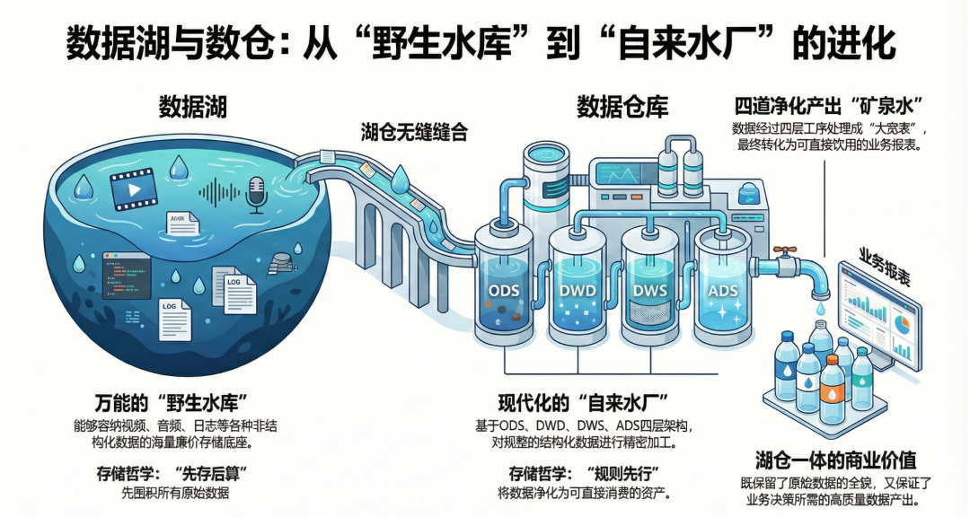 数据湖提供了海量、廉价、包容万象的存储底座。而我们的 ODS、DWD、DWS、ADS 四层架构,就像是建立在这个大湖旁边的一座高度现代化的“水质净化厂”。