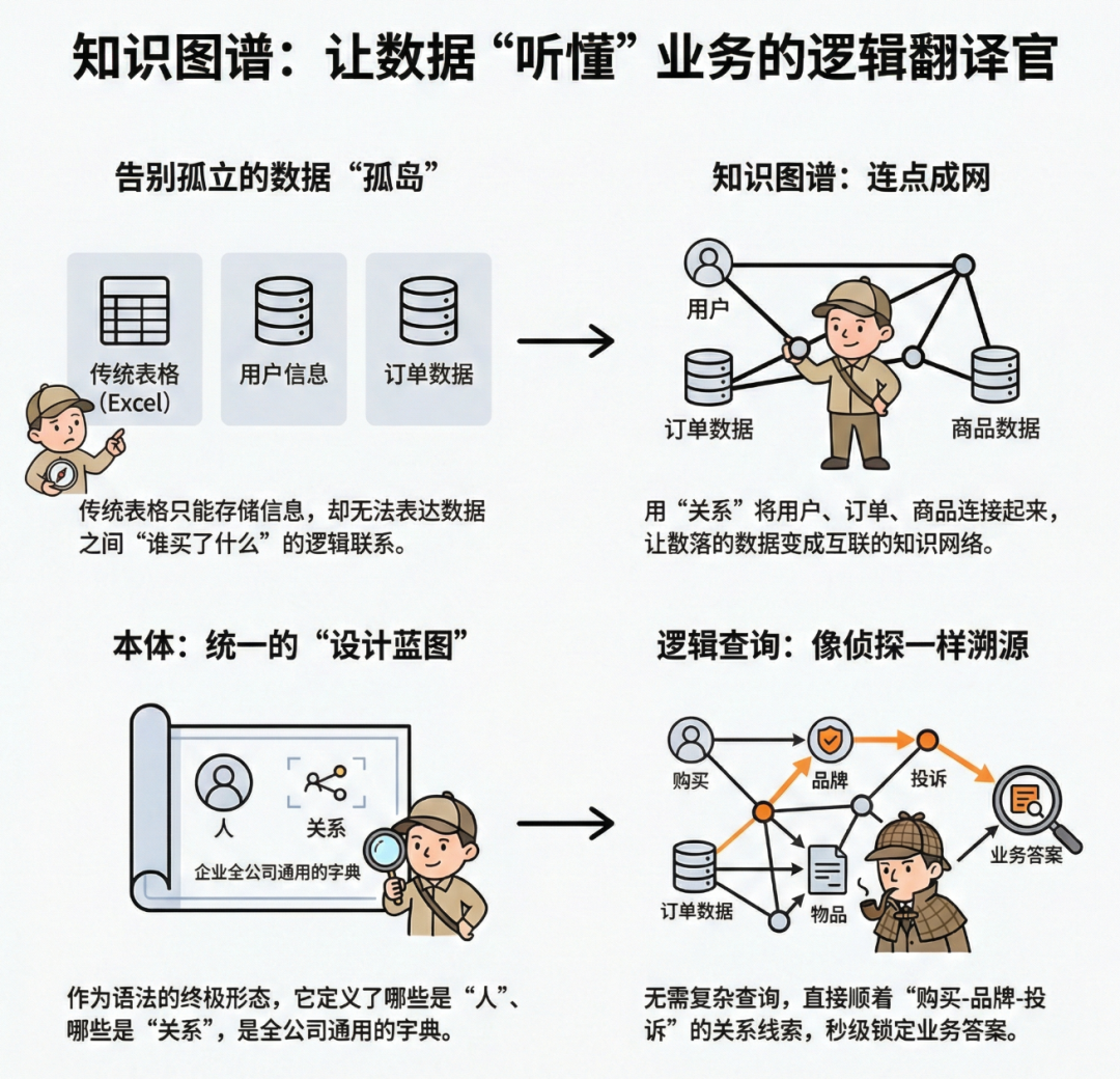 当我们把全公司的核心业务知识,都用“本体”这套语法规则定义清楚,并把各个业务系统的数据,都映射到这张巨大的“知识图谱”上时,那个神奇的“逻辑翻译层”就诞生了。