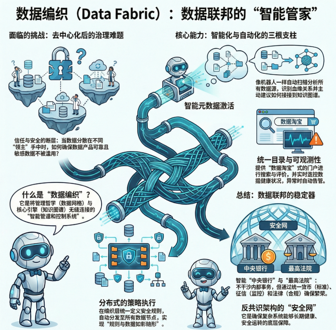 简单来说,“数据编织”就像是给我们的“数据联邦”建立了一套智能化的“中央银行”和“最高法院”。它不干涉各“领地”的内部事务,但它通过发行统一的“货币”(元数据标准)、建立统一的“征信系统”(数据质量监控)和执行统一的“法律”(安全合规策略),确保了整个联邦的繁荣和稳定。