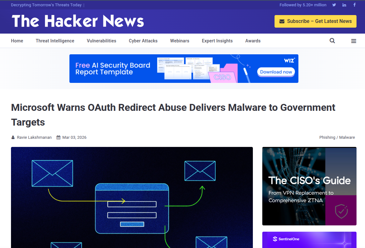 2026年3月,微软安全研究团队披露了一起针对政府及公共部门组织的系列攻击活动。该活动并未利用任何未公开的软件漏洞(0-day),也未直接窃取用户的访问令牌(Token),而是巧妙地滥用了OAuth协议中用于错误处理或特定流程结束的“重定向”功能。攻击者通过在受控租户中注册恶意应用程序,配置指向恶意基础设施的重定向URI,并利用无效的授权范围(Scope)触发身份提供商的重定向行为,从而将受害者无缝引导至托管恶意软件的着陆页。这种攻击手法不仅绕过了基于URL信誉的过滤系统,因为初始链接指向的是合法的IdP域名,而且利用了用户对官方登录流程的心理信任,极大地提高了攻击的迷惑性。