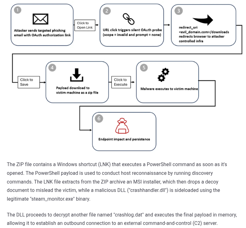随后,攻击者构造一个特制的OAuth授权请求链接。该链接的关键在于其包含的scope参数被故意设置为无效或不存在的内容,或者在请求中嵌入其他能够触发授权服务器进入错误处理流程的参数。当受害者点击该链接并被引导至合法的IdP登录页面时,由于使用的是合法的IdP域名,浏览器的安全指示器显示正常,且电子邮件网关通常不会拦截指向知名云服务商的链接。
