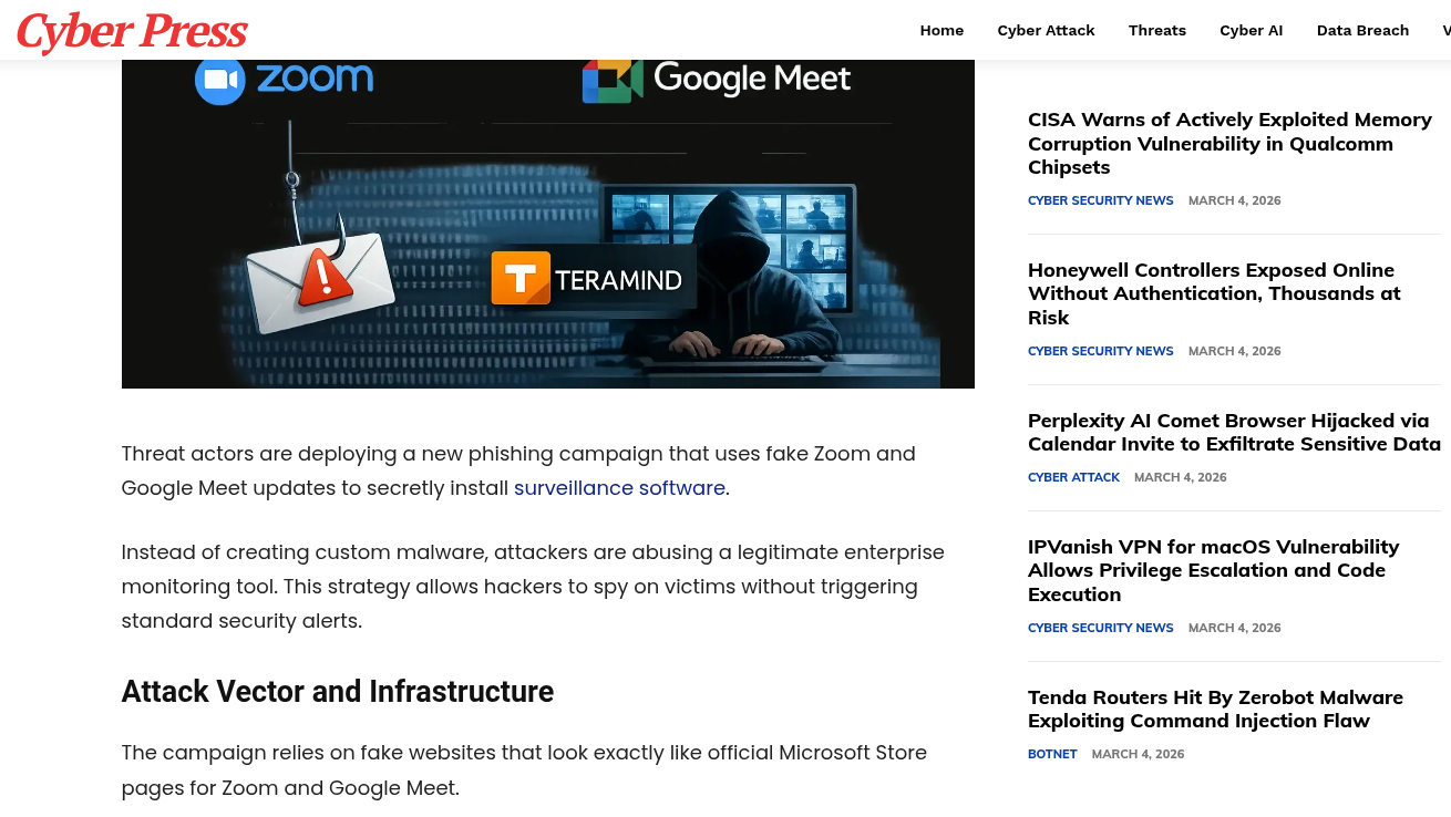 本次研究的对象是一起典型的伪装成Zoom和Google Meet官方更新的网络钓鱼战役。攻击者并未编写全新的恶意二进制文件,而是滥用了名为Teramind的合法员工监控软件。Teramind本身是一款用于企业内部合规性监控、数据防泄露(DLP)和用户行为分析的企业级工具。然而,当这款工具被剥离了其合法的管理外壳,并被嵌入到恶意的分发渠道中时,它就变成了一款功能强大的间谍软件。