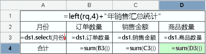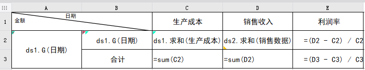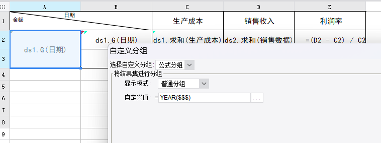 按年分组中,数据库中存储的是日期数据,将日期字段拖拽到A2 单元格,在单元格直接使用 year 函数取年,生产表中单件成本和生产件数是两个字段,要通过这两个字段算出生产成本,C3 单元格公式 =ds1.sum(单件成本 * 生产件数),表达式对数据汇总时,可以先对字段做运算、再汇总。两个数据集间关联通过函数过滤来控制,D2 单元格中表达式 =ds2.sum(单件售价 * 销售件数,year( 日期)==A2 and month(日期)==B2),增加了日期的过滤,这里的过滤条件要手动输入。单元格的汇总、计算比例这些按照 Excel 的基本操作设置就可以,有一点说明下,C3 中对 C2 做汇总,D3 中可以将 C3 的公式复制过来,单元格的引用自动变化,这也是和 Excel 高度保持一致的地方。