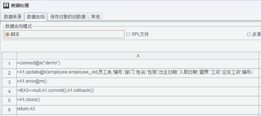 润乾填报功能的侧重点在于数据提取、业务处理及向数据库提交时的业务控制。它采用一个独立填报模型,无法由现有的查询报表直接转换而来,需要重新设计一套专门的填报模板。其主要设计流程分为三个核心环节:数据来源(取数)、填报模板设计、数据去向。其中,数据来源和数据去向均通过其内置的SPL(结构化处理语言)脚本实现,系统提供向导辅助生成,例如在数据来源中设置取数以及在数据去向中配置提交逻辑: