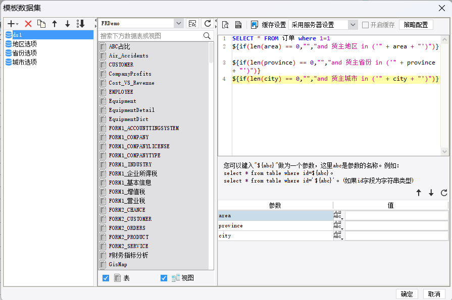 SQL 语句采用拼接方式,可以写入帆软自己的表达式,这里实现了如果参数长度为 0,就忽略这个参数取所有值功能,写起来略有复杂,对开发人员有一定技术上的要求了。