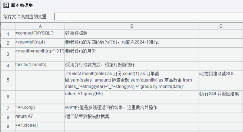 相比之下,润乾报表在数据集层面更倾向于提供统一而灵活的技术实现。主要依托脚本数据集,使用内置的SPL 语法或相关函数,将复杂的数据准备、转换与计算过程通过脚本实现。这种方式虽然对开发人员的技术水平以及学习能力有一定要求,但也因此带来了更强的扩展能力和处理自由度,能够应对结构复杂、逻辑多变的报表场景。