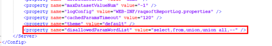 SQL 注入是最常见的数据库安全漏洞之一,数据过滤又是在 SQL 语句中加条件控制,所以参数对数据过滤时是 SQL 注入的主要入口,为了保证数据安全,可以在润乾的配置文件中加入禁用敏感词列表: