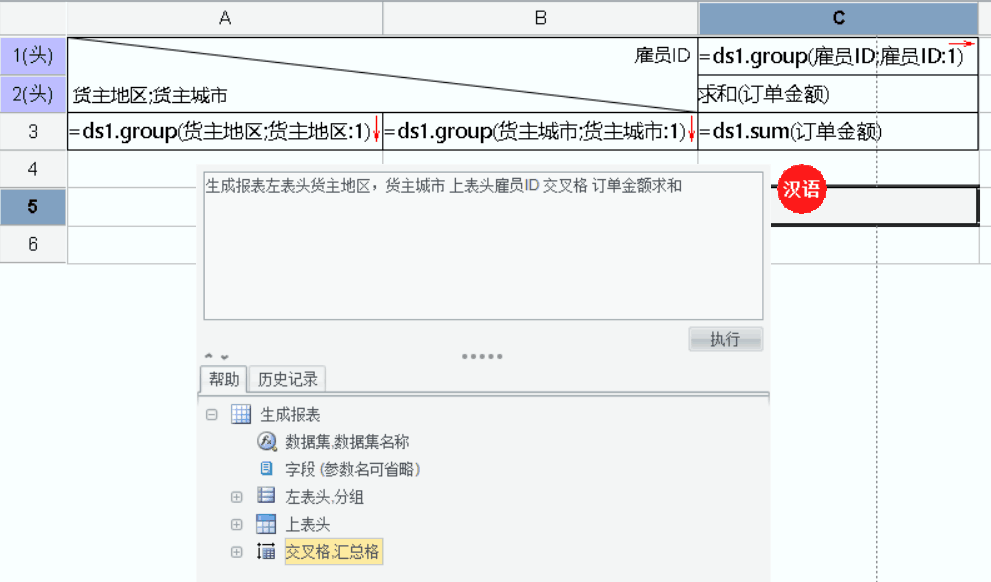 润乾报表最新版中增加了汉语报表功能,可以通过一系列汉语命令协助完成报表数据集、单元格公式、样式等设置,降低报表开发难度,如:通过一句汉语指令就可以协助生成一个多层交叉扩展报表: