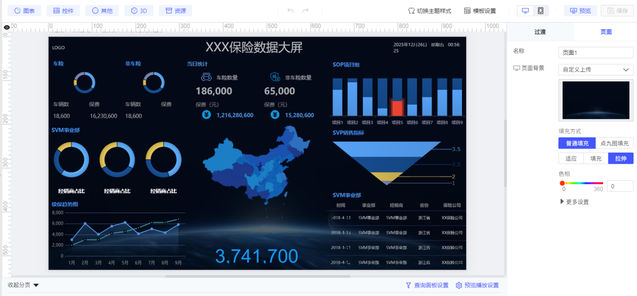 在操作方式上,FineVis 采用直观的控件拖拽式布局,用户可以自由调整每个组件的大小与位置,实现高度灵活的版面设计。组件的属性设置多样,不仅涵盖边框、背景、3D 效果、阴影等视觉样式,还支持交互事件与动画效果的配置,让静态图表“活”起来。设计器内置了浏览器预览功能,能够实时呈现大屏的最终效果,真正做到了所见即所得,提升了设计效率: