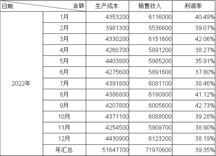 对数据汇总时,暂时没找到字段间的计算操作,所以生产成本这里,要数据集SQL 里增加了个字段先对两个字段相乘,然后报表中用新字段汇总。