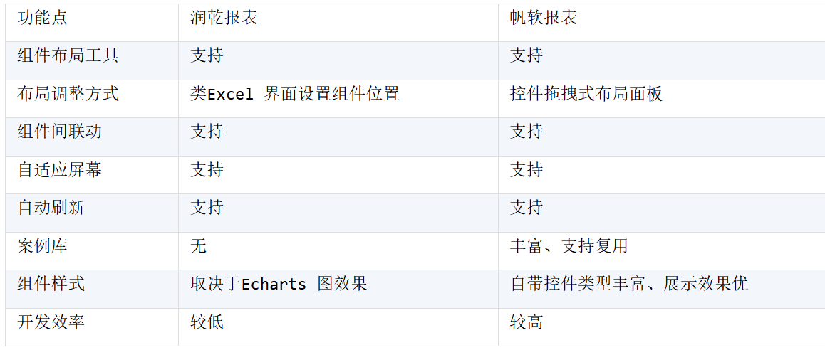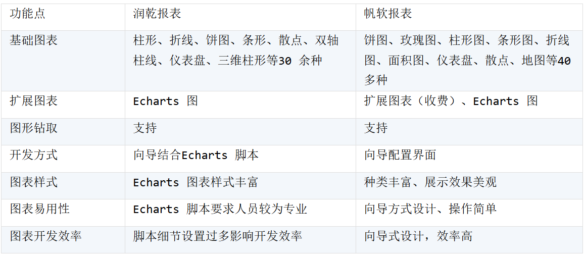 小结:帆软报表在统计图方面的综合表现更优,其图表种类丰富、视觉效果出众且配置过程较为简便。而润乾报表的核心优势仍集中于数据处理层面,其自带的统计图展示效果相对基础;虽然通过集成Echarts 能够实现更丰富的可视化效果,但这往往要求开发人员具备较高的前端技术能力,许多配置需要通过修改脚本完成,一定程度上影响了开发效率。