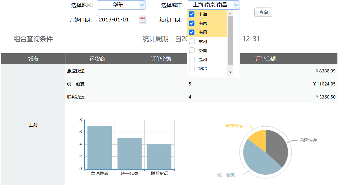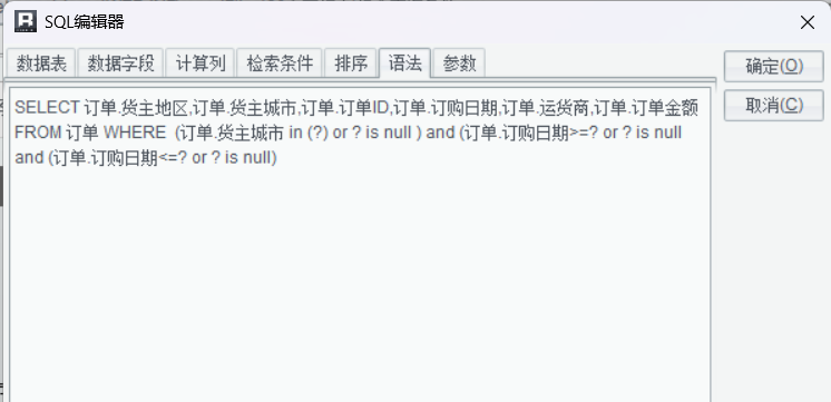 这里采用JAVA 程序执行 SQL 语句的写法,用? 做为参数的替代符,其中货主城市 in (?) or ? is null,表示如果城市参数不为空时取对应城市数据,为空时忽略掉该条件,取所有数据,写法本质上就是标准的 SQL 语句。
