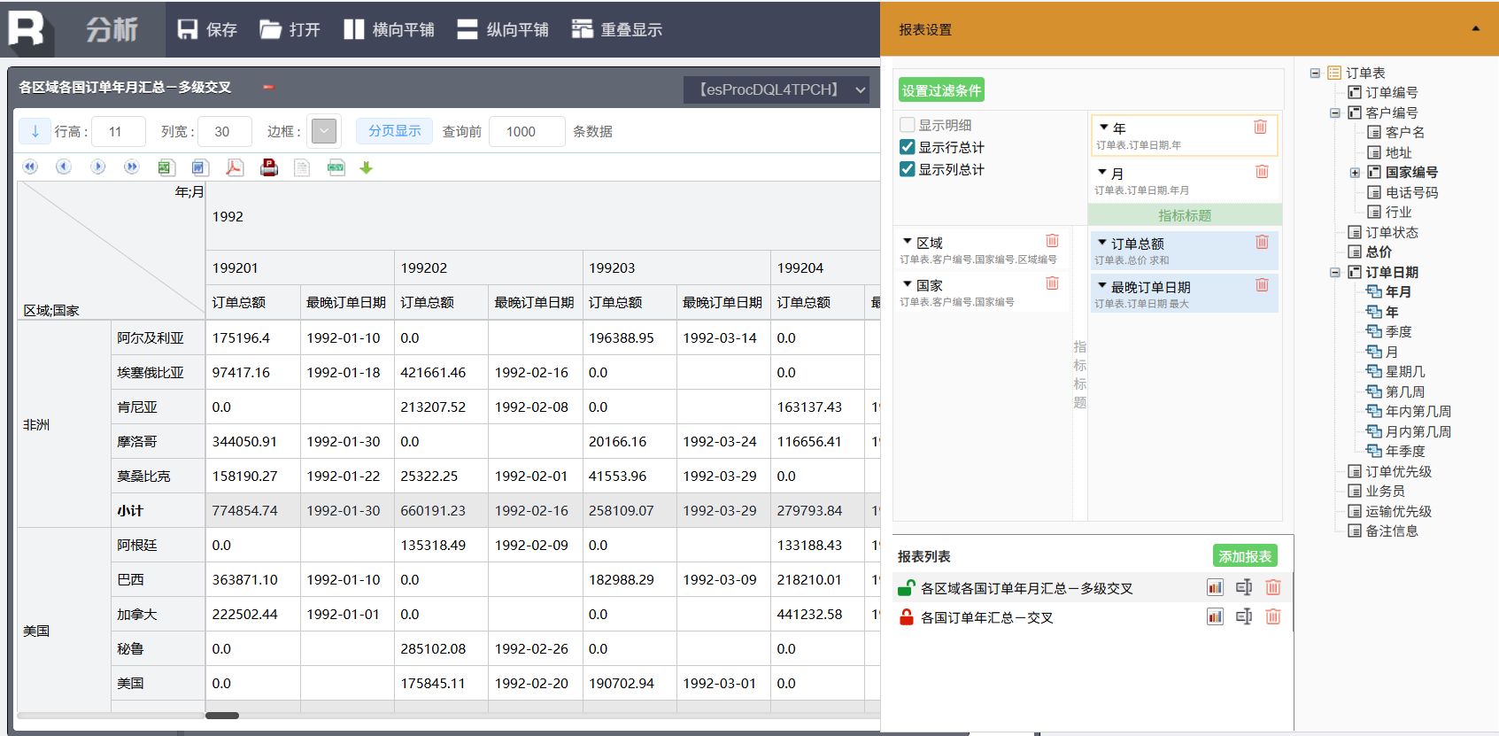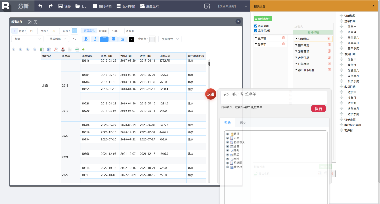 查询后的结果数据,可以快速进入分析页面,实现查询数据的图、表展示与汇总分析,并提供了汉语言报表功能,通过汉语言灵活做数据分析: