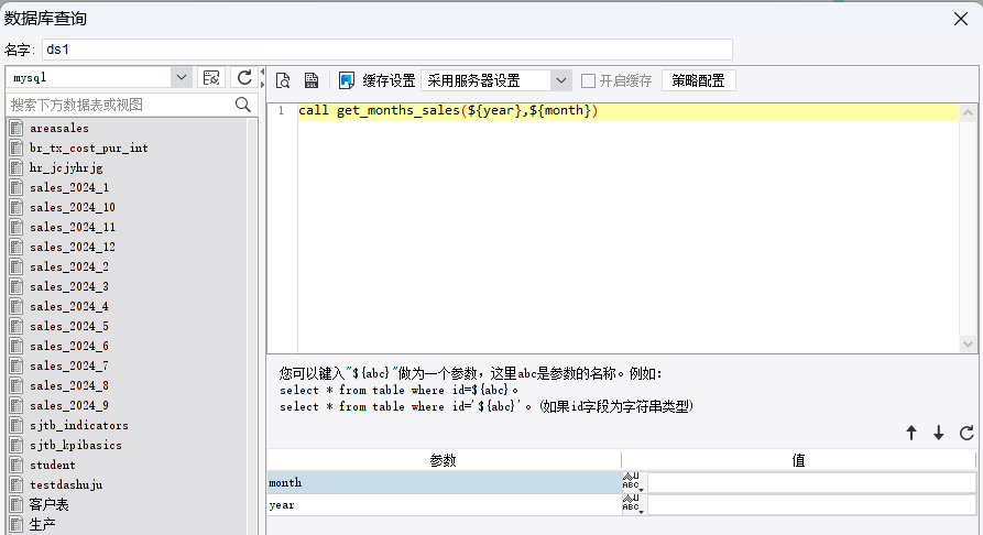数据集创建完后,报表模版中一个列表格式就可以了。但是如果需求变化,需要根据参数取整年数据,那表名称是完全动态的,这种方式就不适合了,需要使用存储过程方式,在数据库中建立存储过程: