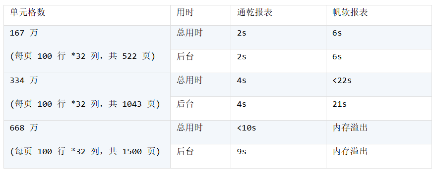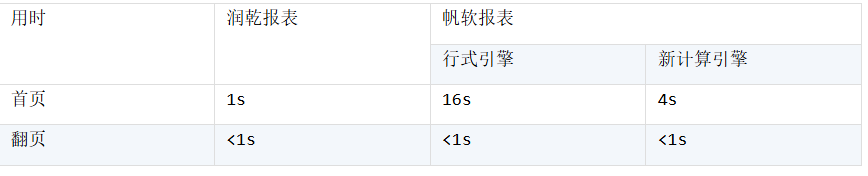 从测试数据来看,润乾报表的容量支持更好,计算速度更高。当数据量达到一定规模后,帆软出现无法容纳而内存溢出的情况了。另外,在容量许可的情况下看用时,润乾的性能也要好很多,可以反应出计算引擎更为高效。