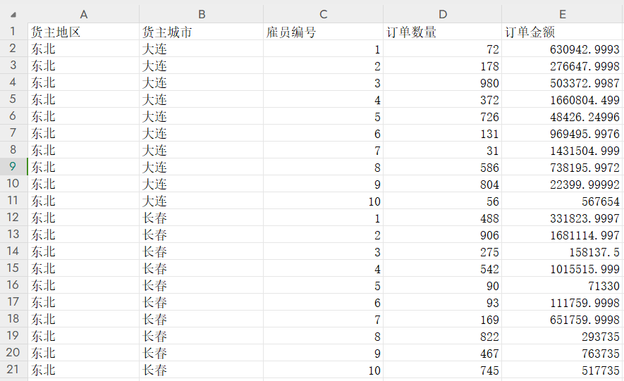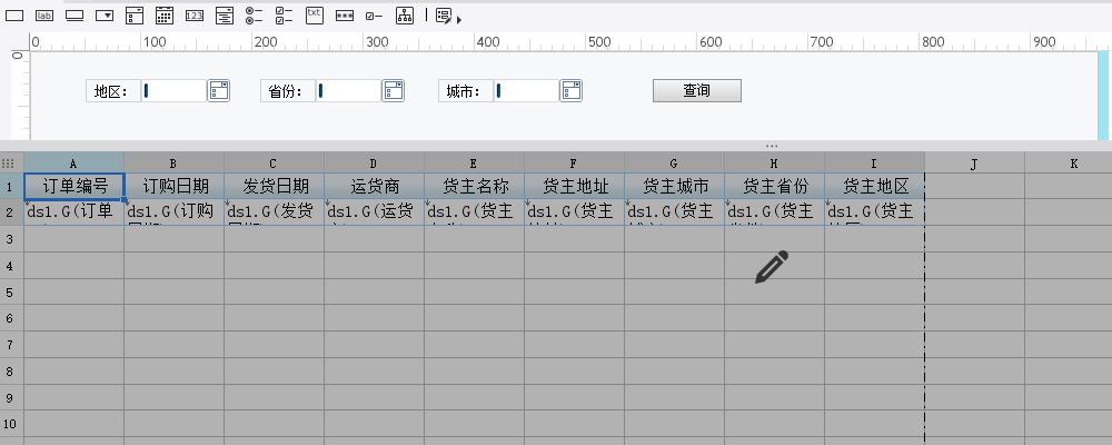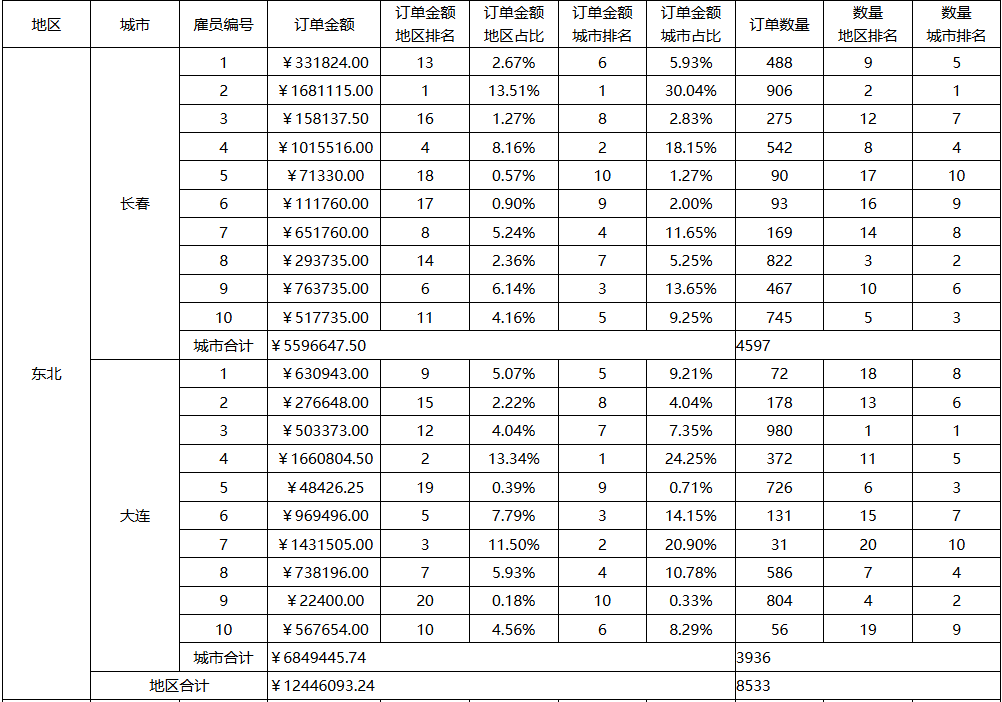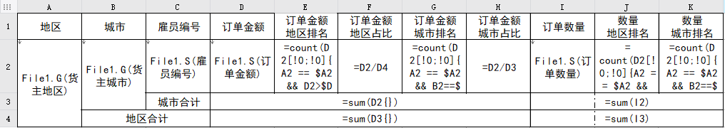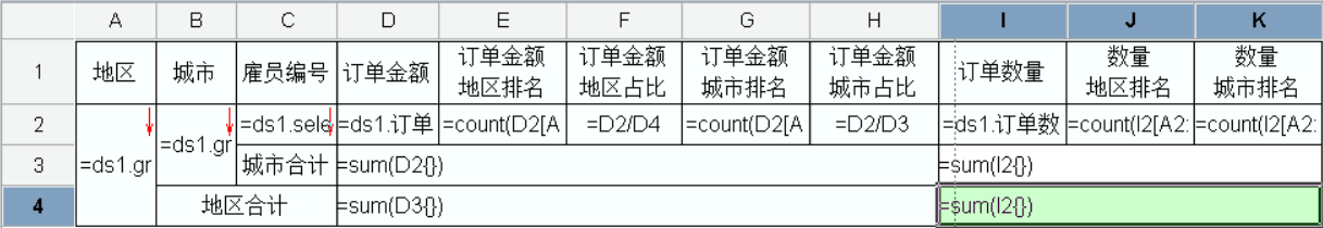 要求按照地区、城市维度汇总数据,并计算订单金额、订单数量的占比及排名情况。这是一个典型的跨行组计算的报表,主要考察报表的格间计算能力,模版如下: