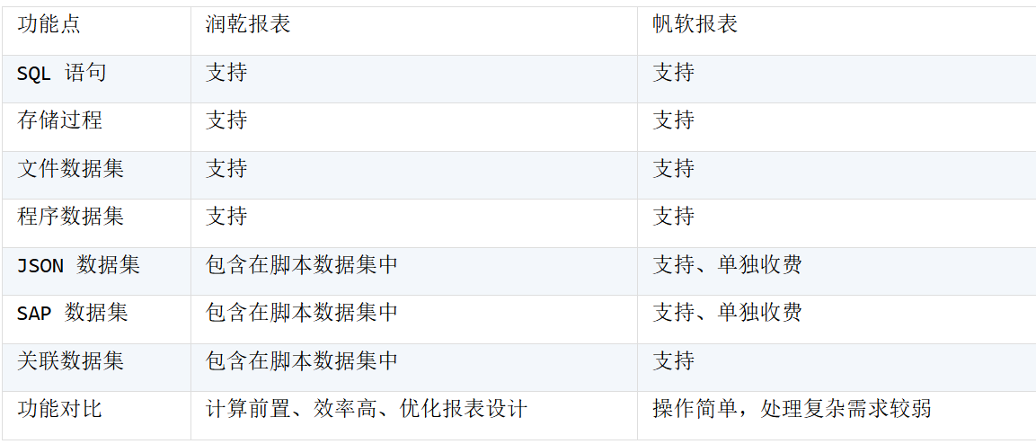 两款工具的数据集类型有多种是相同的,如SQL 语句、存储过程、文件数据集、程序数据集,使用方式基本上也完全相同,就不做具体对比了。这里主要对比下功能相同、但是实现方式有差别的数据集类型,润乾报表主要通过脚本数据集实现用户的特殊需求,帆软报表中根据不同类型,分为JSON 数据集、树数据集、关联数据集等,所以这里以帆软为准,看下同功能在两款工具中的实现区别。