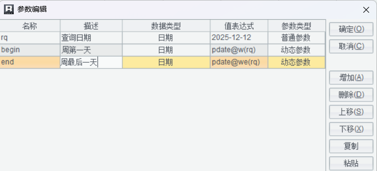 润乾报表参数类型分为普通参数和动态参数,普通参数主要用于接收外部系统或者参数面板传入参数的值,动态参数内可以设置润乾表达式,比如做周报表时,可以定义一个日期参数接收传入的日期,再定义两个动态参数取该日期所在周的第一天和最后一天: