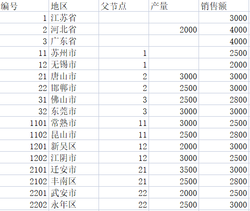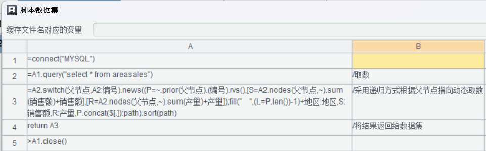 数据表中通过父节点字段来确定层级关系,润乾报表可以在脚本数据集中根据数据做递归查询,通过一个语句直接返回树状的层级关系: