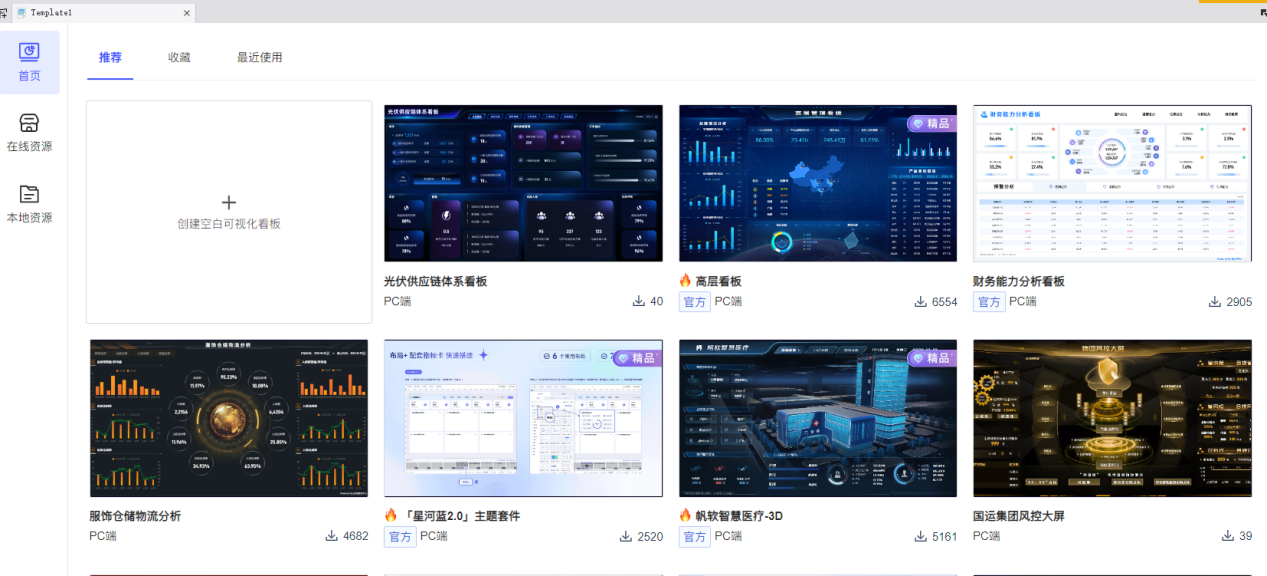 帆软报表提供的数据可视化设计工具FineVis 已经无缝集成到其报表设计器中,为用户打造了一体化的数据应用开发工具。该工具内置了丰富的预置面板资源库,对于尚未完全明确自身可视化需求的用户,这些模板可以作为优秀的起点和灵感来源。