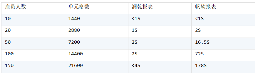 报表制作过程两款工具基本一致,具体制作就不做过多说明,通过增加雇员数量模拟不同数据量下报表工具的性能差异,测试结果如下: