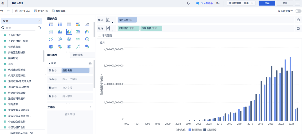对于AI 的应用,推出了 FineChatBI,FineChatBI 是一款通过自然语言对话实现智能数据分析的工具。其核心功能是让用户直接用业务语言提问(例如“对比一下各区域本季度的销售完成率”),系统便能自动理解查询意图、生成数据查询语句,并将结果以可视化图表和文字解读的形式即时返回。用户还可以通过连续对话进行数据下钻、切换维度或图表类型,完成多轮交互式分析,最终形成分析文档报告分享给他人。