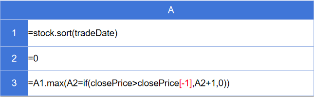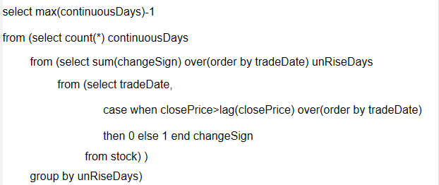 值得关注的是,润乾增加了独立的计算引擎SPL,也就是脚本数据集,能够将复杂的数据获取、转换与计算过程从报表模板中剥离出来,实现了计算逻辑的前置。在数据集功能点对比时,看到脚本数据集结合了 SQL 的集合处理能力与 Java 的过程控制优势,并配备了可视化调试工具,使得开发人员可以像调试程序一样分步跟踪数据执行结果,这大大提升了复杂数据准备的开发效率和问题排查能力。这种“强数据准备、轻单元格计算”的架构,不仅降低了报表模板本身的复杂度,也使报表引擎能更专注于渲染和展示,从而在整体上提升了报表的性能与可维护性。如需要查看“某支股票最长连续涨了多少交易日”时,通过 SQL 去实现需要多行语句: