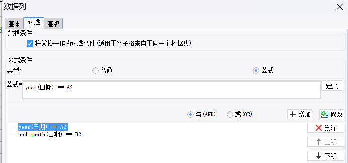 这种向导方式对初学者比较友好,多个条件看起来逻辑比较好区分,但是如果再需要修改公式,也同样要通过这个向导页面来操作,操作上反而有点麻烦。