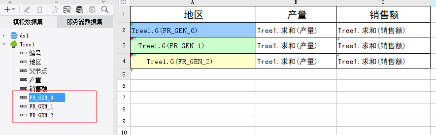 数据中有三个层级,这里会自动增加三个字段存储不同层级信息,制作报表模版如上图,有几个层级报表中增加几行,然后设置左主格方式达到跟随扩展的目的。