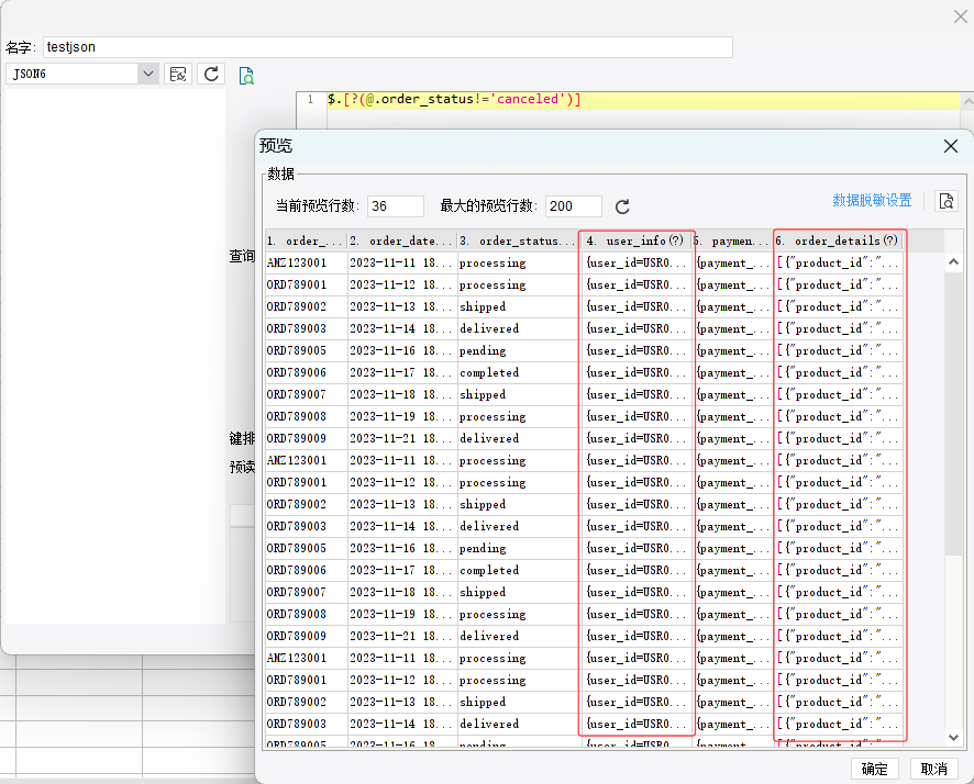 在JSON 数据集插件中,可以读取多层 JSON 数据并对数据进行过滤,但是需求中的数据分别在 user_info 和 order_details 节点内,在 JSON 插件内没法跨节点计算,所以该需求没法直接在 JSON 数据集内实现,可能还需要写代码了,这里就不写了。当然,这个需求有点复杂了,如果对于结构比较标准的 JSON 数据来说,这里通过向导来实现就非常容易。