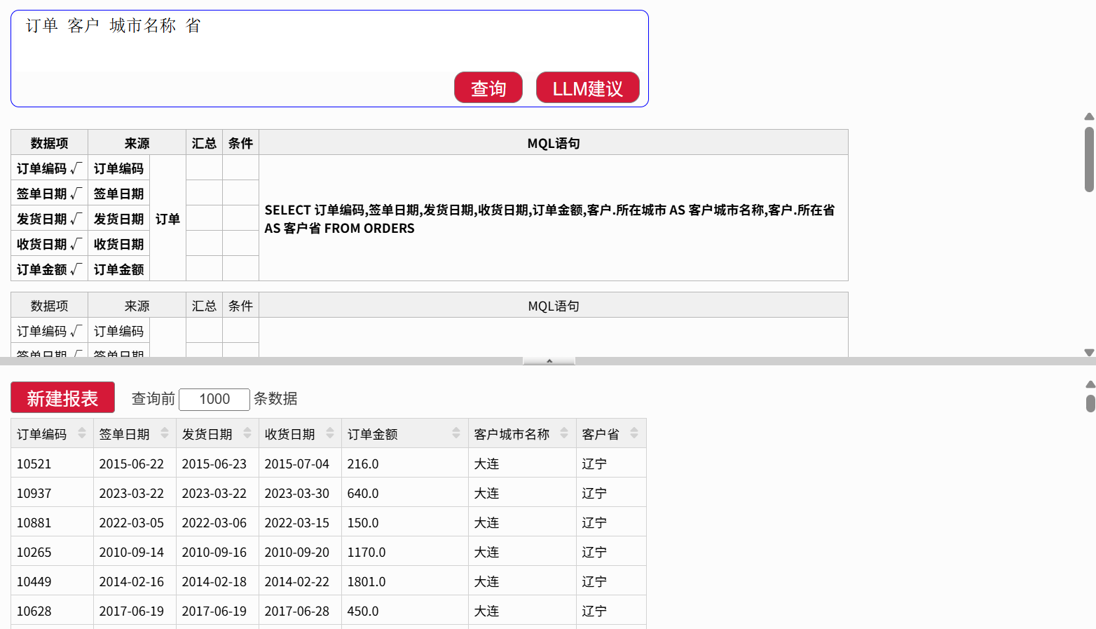 此外,润乾BI 的 DQL 和 NLQ(自然语言查询),进一步强化了数据查询的灵活性,NLQ 支持通过自然语言描述(如 “每年各股票,最大月连涨天数”)自动生成查询逻辑,降低了查询操作的技术门槛,LLM 接入了 DeepSeek,协助生成更精准的 NLQ 语句,提升了BI 使用的便捷性,并且由于借助了 DQL 模型,查询时是可以直接做跨表查询的: