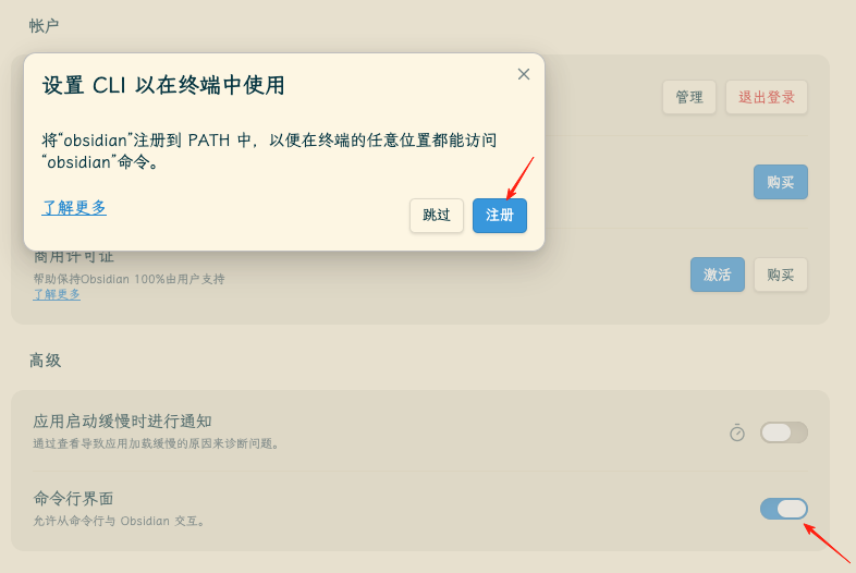 升级后在设置中选择打开命令行界面,然后在弹窗中点击注册即可