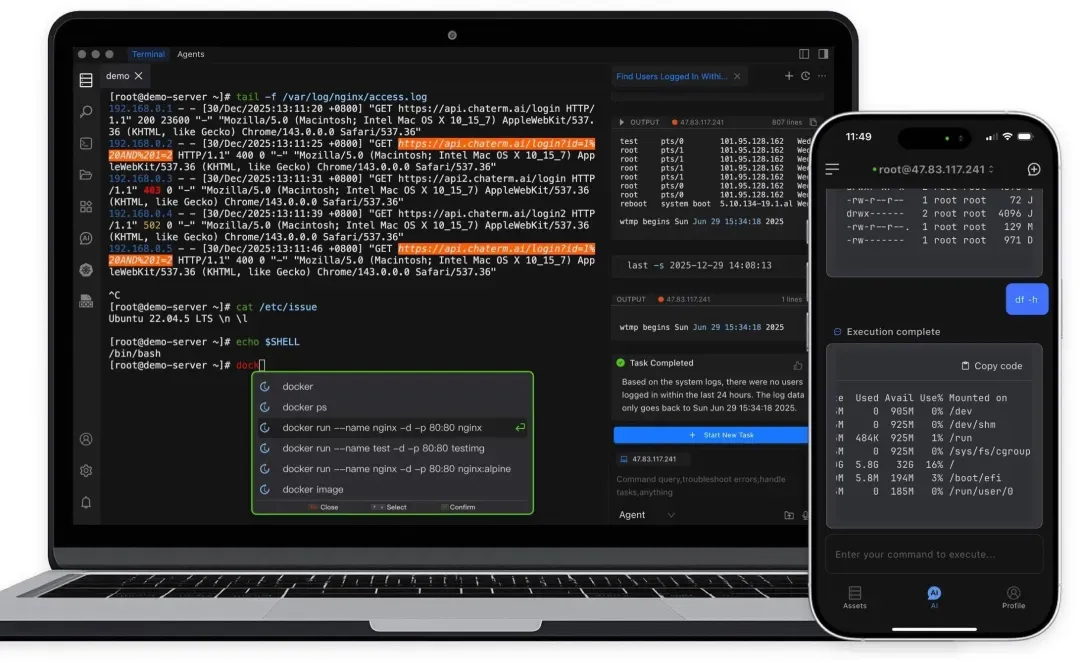 在遇到上述紧急情况时,用户只需要掏出手机,打开 Chaterm,连接服务器(Chaterm 支持零信任可信设备快速连接,免去输入各种烦人的密码和验证码, 并且客户端配置好的资产信息会自动同步到移动端,无需重复配置)。