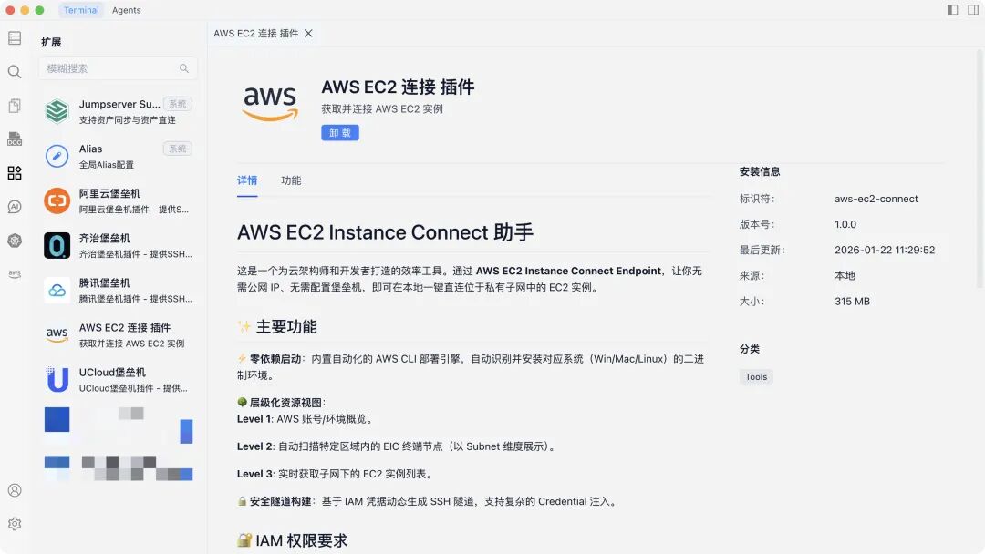 以 AWS 为例,我们可以安装 AWS EC2 插件,通过 IAM 和 STS 授权,分配一个安全的动态的 Token,Chaterm 通过这个 Token 建立一个直达 VPC 内部可靠的安全连接,并展示出所有符合用户权限的 EC2,用户只需要一键点击就可进行连接,全程不需要任何形式的对外 IP,对外服务(堡垒机也不需要)或对外端口暴露。即使在绝密的隔离网络中,也能通过 Chaterm 实现 EC2 的安全管理!