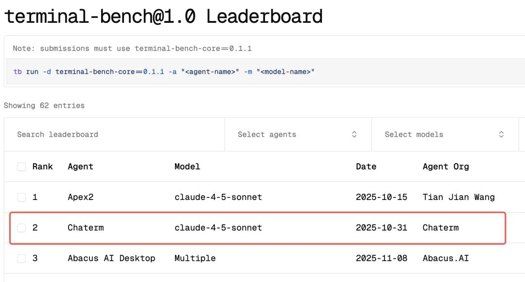 Chaterm 位列 Terminal Bench 1.0 Leaderboard 榜单第二名。